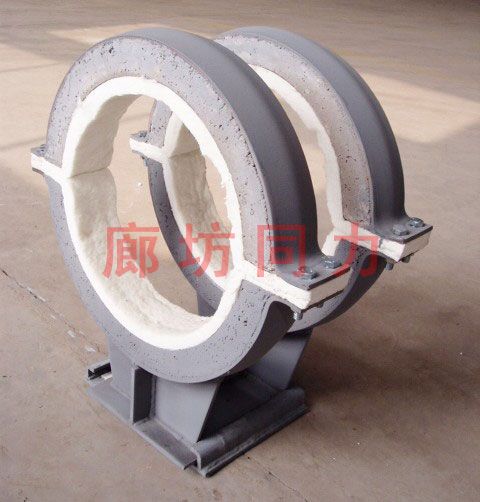 隔熱管托適用于高溫蒸汽管道的支撐部位,配件包括底座、管夾、隔熱層。隔熱材料一般選用蛭石、硅酸鈣、澆筑復(fù)合材料等。澆筑復(fù)合材料是一種硬質(zhì)隔熱保溫材料,主要由陶粒、珍珠巖、鐵黑粉、氧化鎂通過粘結(jié)劑混合后固化而成。陶粒和珍珠巖能起到較好的隔熱保溫作用;鐵黑粉與陶粒珍珠巖氧化鎂混合后凝結(jié)在一起,能提高抗壓強度及硬度;加入硅酸鋁后能提高粘結(jié)牢度,進一步提高強度和硬度,降低導(dǎo)熱系數(shù)。產(chǎn)品具有抗壓強度高、熱傳導(dǎo)率低、吸水率低的特點,適應(yīng)既要低導(dǎo)熱系數(shù),又要高抗壓系數(shù)的場合。