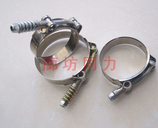 T型彈簧卡箍包括外圈、橋板、螺釘、T型管和螺母。其原理為外圈的兩端部有條形通孔、外圈向卡箍圓周外彎折并分別與外周面固定形成掛接部和第二掛接部、橋板活動(dòng)固定在掛接部?jī)?nèi)、T型管安裝在第二掛接部?jī)?nèi)、螺釘穿過(guò)掛接部和安裝在第二掛接部?jī)?nèi)的T型管與螺母連接、在螺釘上套裝有墊圈和彈簧。其特點(diǎn)在于螺釘上裝有彈簧,通過(guò)壓緊彈簧縮小外圈直徑為卡箍本體的緊固提供補(bǔ)償。該卡箍為柔性連接,可有效解決機(jī)械震動(dòng)帶來(lái)的緊固松動(dòng)問(wèn)題;抗震效果好,適合多種環(huán)境且經(jīng)久耐用。
