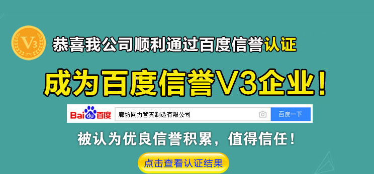 時光荏苒,歲月如梭。一眨眼的時間,廊坊同力管夾制造有限公司和百度即將走過第十一個年頭。雙方始終遵循誠信、合作、服務、奉獻的原則,為廣大用戶提供高效便捷可靠地服務。合作期間,百度把同力管夾公司的信息帶到了全國各地,讓更多的用戶知道了同力管夾公司的存在;同時密切關注著同力公司的誠信建設工作。本著讓誠信的商人先富起來的原則,百度信譽對同力管夾做了信譽V體系認證,從初的V1級已獲實名認證,開始積累信譽到V2級基礎信譽積累,可接洽商談再到后的V3級優(yōu)良信譽積累,值得信任。同力管夾可謂是一步一個腳印,產品對得起良心。當然這一切都離不開廣大用戶的支持和厚愛,在接下來的日子里,同力管夾將一如既往地為用戶提供貼心和誠信的服務,為構建和諧誠信社會貢獻自己的力量。