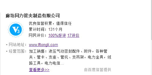 廊坊同力管夾制造有限公司成為百度信譽V3用戶,合作時間131個月。